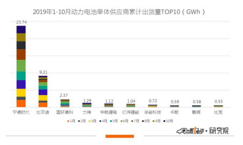 2019年1-10月總裝機量為46.2GWh。其中,TOP10車企共裝機41.2GWh,占比89.2%。
