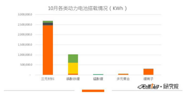 10月三元材料的搭載量為2.67GWh,其中乘用車占92.3%,三元材料搭載量占總搭載量的65.4%,與9月基本持平。磷酸鐵鋰電池隨著專用車產(chǎn)量提升總裝機量也略微提升至1.03GWh,在月度裝機中的占比也上漲至25.1%。錳酸鋰與多元復合電池9月合計裝機80.4MWh,占比2%。