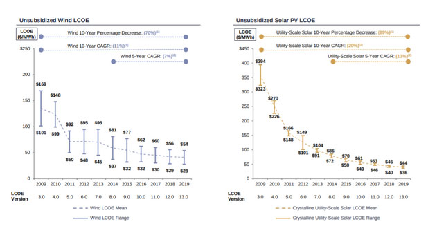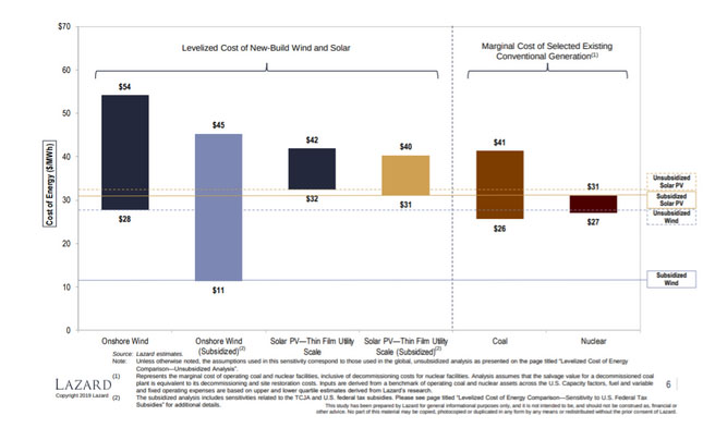 如果將美國(guó)聯(lián)邦補(bǔ)貼包括在內(nèi),Lazard公司建設(shè)新的陸上風(fēng)力發(fā)電(平均28美元/MWh)和電網(wǎng)規(guī)模的太陽(yáng)能發(fā)電(36美元/MWh)的成本與燃煤發(fā)電(34美元/MWh)和核能發(fā)電(29美元/MWh)的邊際成本具有競(jìng)爭(zhēng)力。