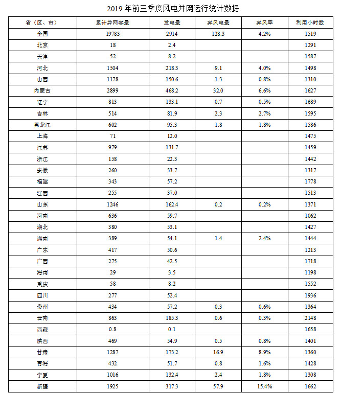 2019年1-9月,平均利用小時(shí)數(shù)較高的省份是云南(2148小時(shí))、四川(1936小時(shí))。2019年1-9月,棄風(fēng)仍較為嚴(yán)重的地區(qū)是新疆(棄風(fēng)率15.4%、棄風(fēng)電量57.9億千瓦時(shí))、甘肅(棄風(fēng)率8.9%、棄風(fēng)電量16.9億千瓦時(shí))、內(nèi)蒙古(棄風(fēng)率6.6%、棄風(fēng)電量32.0億千瓦時(shí))。