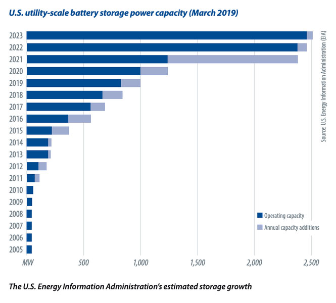 部署電池儲能系統(tǒng)開始在市場上獲得利潤,提供了短暫的頻率調(diào)節(jié)或低價套利。特斯拉公司在澳大利亞部署的早期大型儲能項目提供了一種算法驅(qū)動的電池組,該電池組可以在較短的時間內(nèi)接入更大的電網(wǎng),以更好地匹配負(fù)載峰值。在其他領(lǐng)域,電動汽車充電廠商已經(jīng)開始對小部分負(fù)載進行時間轉(zhuǎn)移,使用電動汽車作為需求側(cè)管理,從而為電池儲能系統(tǒng)的應(yīng)用打開了大門。早期的儲能項目大多規(guī)模很?。弘姵厝萘靠梢詾槌鞘须妱庸财囂峁┭a充電力,或者用于微電網(wǎng)的本地試驗。