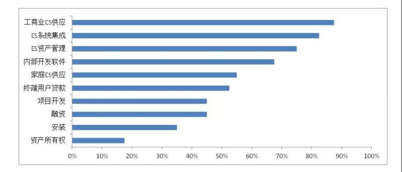 圖3 美國40個(gè)用戶側(cè)儲(chǔ)能市場(chǎng)參與主體提供的服務(wù)及提供此項(xiàng)服務(wù)的企業(yè)數(shù)量占比