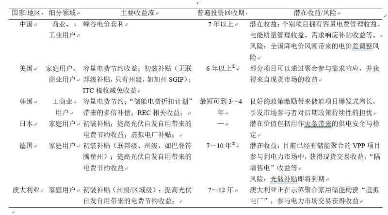 表1 主要國家分布式儲(chǔ)能的收益流