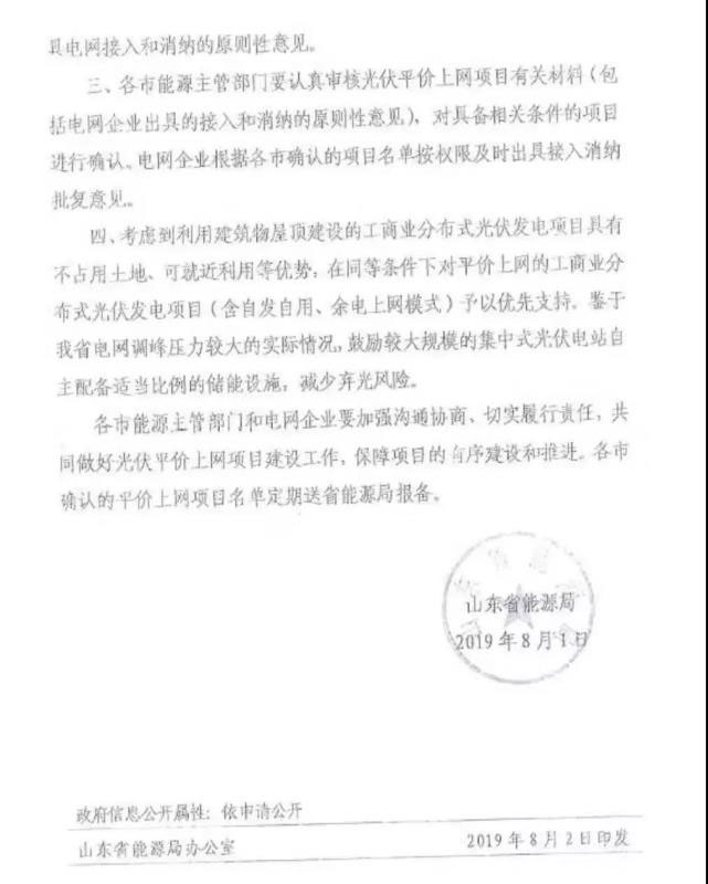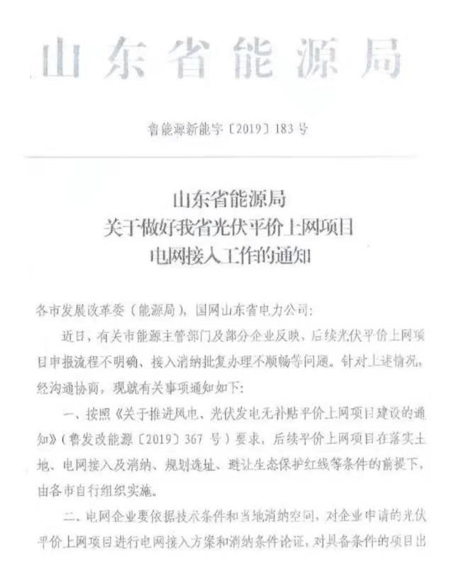 中國(guó)儲(chǔ)能網(wǎng)訊:近日,山東能源局印發(fā)了《關(guān)于做好我省平價(jià)上網(wǎng)項(xiàng)目電網(wǎng)接入工作的通知》,文件中指出,近期有市級(jí)主管部門以及企業(yè)反映,后續(xù)光伏平價(jià)項(xiàng)目存在項(xiàng)目申報(bào)流程不明確、接入消納批復(fù)辦理不順暢等情況,針對(duì)上述問題,山東能源局要求電網(wǎng)企業(yè)依據(jù)技術(shù)條件和當(dāng)?shù)叵{空間,對(duì)具備條件的項(xiàng)目出具電網(wǎng)接入和消納的原則性意見;各地主管部門要認(rèn)真審核平價(jià)項(xiàng)目相關(guān)材料,對(duì)具備條件的項(xiàng)目進(jìn)行確認(rèn);最后電網(wǎng)企業(yè)根據(jù)各市確認(rèn)的項(xiàng)目名單按權(quán)限及時(shí)出具接入消納批復(fù)意見。