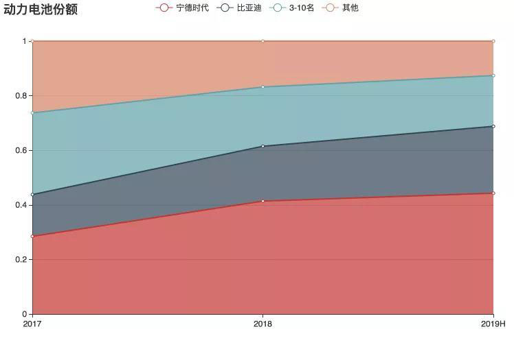 2019上半年,裝機(jī)量排名第3到10名企業(yè)合計(jì)裝機(jī)量5.6GWh,合計(jì)份額占總裝機(jī)量18.6%,較去年21.7%的份額進(jìn)一步下降。而對(duì)應(yīng)的是,寧德時(shí)代和比亞迪裝機(jī)量占比達(dá)到全行業(yè)的68.9%,較去年的份額,市場(chǎng)份額進(jìn)一步向第一梯隊(duì)集中。