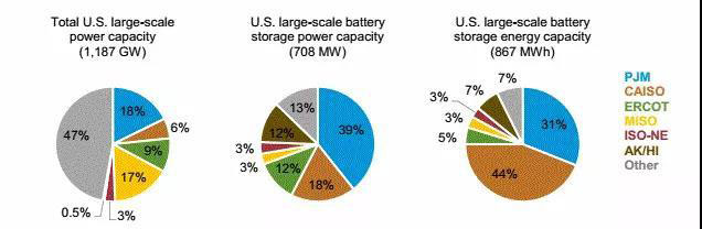 雖然PJM的總裝機(jī)量占美國現(xiàn)有大型電池儲能容量的18%,但卻占2017年美國能源容量的44%,如圖3所示。