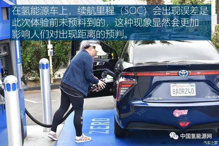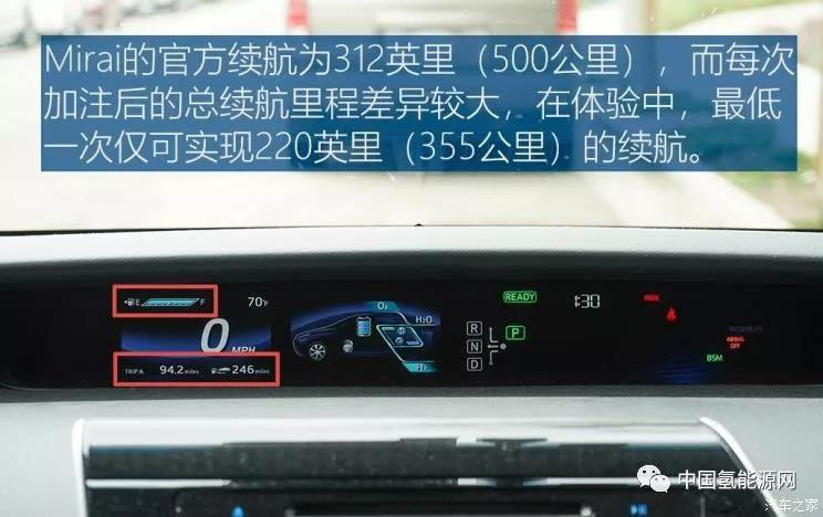 這里重點說一下氫能源汽車續(xù)航的問題,目前像豐田Mirai、本田CLARITY以及現(xiàn)代NEXO單次加氫都能夠實現(xiàn)超過400公里的續(xù)航里程。但每次加氫100%后的續(xù)航里程并不同,高低差能夠接近150km,因為從車輛本身攜帶的氫罐和加氫站都受到溫度、壓強等外界因素的影響,以我租到這臺Mirai,在三次加氫后總續(xù)航里程均不同,而純電動車則不會有這種情況。