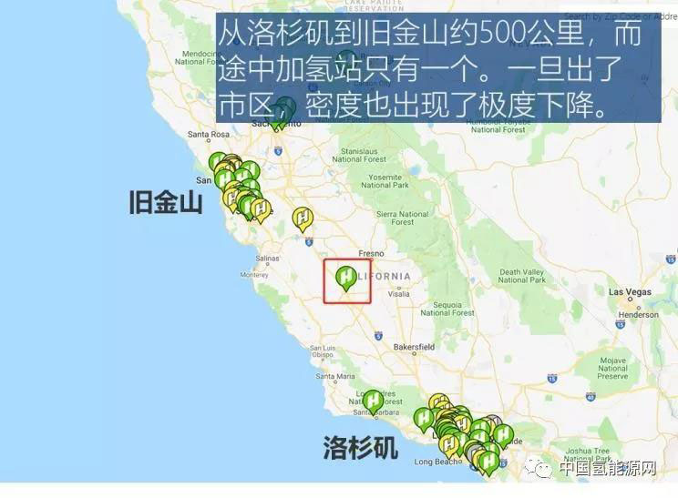 在此行之前,我已經對加州地區(qū)加氫站的具體分布有了初步的了解,首先是加氫站的建設目前還主要集中在南加州,以舊金山和洛杉磯為主要的示范地。同時站點主要分布在了市區(qū)內,一旦出了市區(qū),數(shù)量開始以個位數(shù)計算,覆蓋密度從市區(qū)內的每30公里一個下降到了每300公里一個。