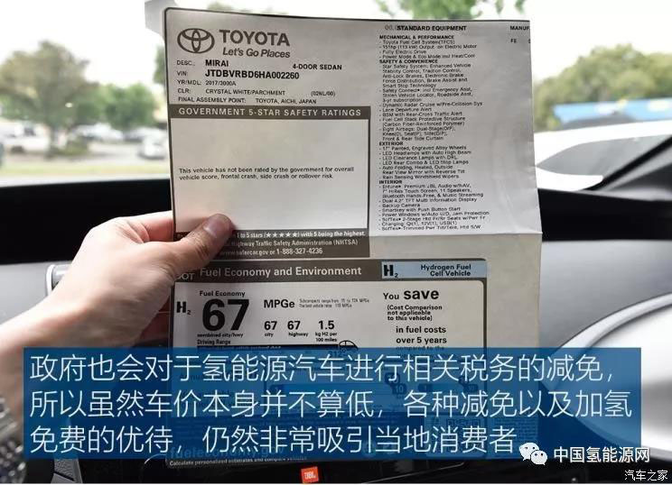 此外,品牌也聯(lián)合政府對消費者在購車方面給出了足夠的優(yōu)惠措施,目前豐田Mirai在美國的單車售價約為40萬人民幣(58385美元),這個價格對于美國汽車市場而言絕對不算低。但為了引導消費,豐田會在用戶購買車輛的同時,附贈一張免費的加氫儲值卡,其中的額度足以支持車輛加注超過1000次,約等于車輛終生都可以免費加氫(以加注一次續(xù)航500公里計算),這對于城市面積巨大的加州地區(qū)而言,對于消費者的誘惑還是很明顯的。