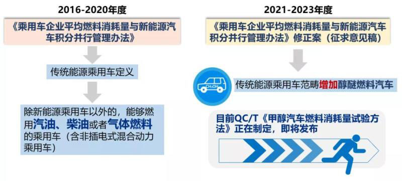 2019年3月工信部等八部門發(fā)布的《關于在部分地區(qū)開展甲醇汽車應用的指導意見》(工信部聯(lián)節(jié)〔2019〕61號)中,提出了將甲醇汽車納入《積分辦法》管理范疇,本次《征求意見稿》中修改了傳統(tǒng)能源乘用車的定義,將能夠燃用醇醚燃料的乘用車也納入積分核算。目前甲醇汽車燃料消耗量測試相關標準正在制定中,后續(xù)將與修訂后的積分政策配套實施。