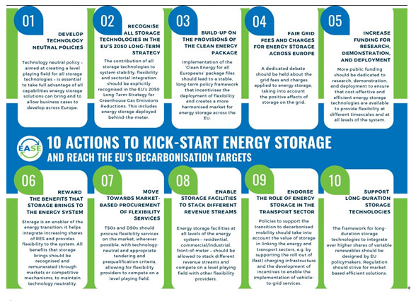 根據(jù)歐盟描述的“2050年的脫碳場景”(到2050年與1990年的水平相比減少80%,到2050年減少凈零排放),2050年,歐洲電力系統(tǒng)固定儲能容量可能高達450TWh。包括公用事業(yè)公司、技術(shù)供應(yīng)商以及配電和輸電網(wǎng)絡(luò)運營商在內(nèi)的歐洲儲能協(xié)會(EASE)發(fā)布了其“啟動”儲能10個建議,并通過歐洲最常用的七種語言對外發(fā)布。