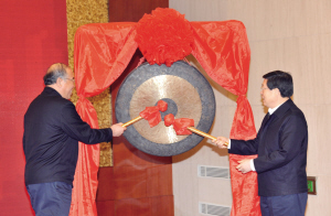 中國儲能網(wǎng)訊:12月26日,天津市碳排放權(quán)交易鳴鑼啟動,成為繼深圳、上海、北京、廣東之后第五家正式啟動的碳排放交易試點。圖為當日在天津碳排放權(quán)交易啟動儀式上,國家發(fā)改委副主任解振華(左)和天津市市長黃興國共同為開市鳴鑼。