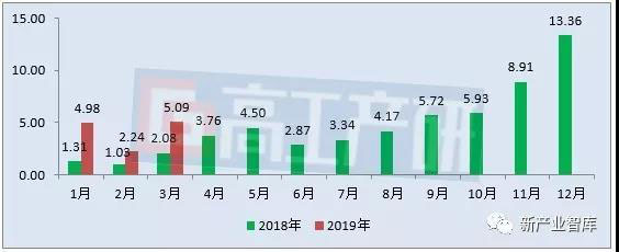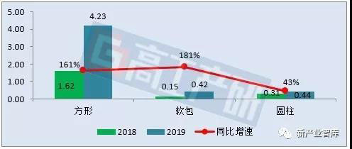 從不同電池形狀來(lái)看,2019年3月方形電池裝機(jī)電量約4.23GWh,同比增長(zhǎng)161%;軟包電池裝機(jī)電量約0.42GWh,同比增長(zhǎng)181%;圓柱電池裝機(jī)電量約0.44GWh,同比增長(zhǎng)43%。