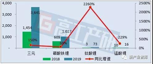 從不同電池類型來(lái)看,2019年3月磷酸鐵鋰電池裝機(jī)電量約1.03GWh,同比增長(zhǎng)69%;三元電池裝機(jī)電量約3.64GWh,同比增長(zhǎng)150%;鈦酸鋰電池裝機(jī)電量約0.07GWh,同比增長(zhǎng)超22倍之多;錳酸鋰電池裝機(jī)電量約16MWh,同比增長(zhǎng)229%。