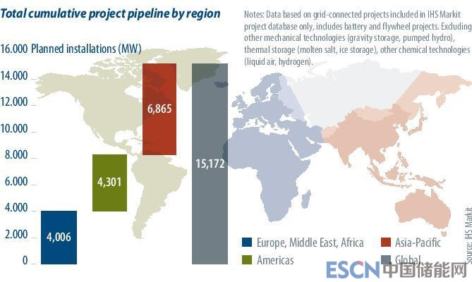 美國市場在2019年呈指數級增長,美洲已經有一個超過的項目4.3 GW。隨著政策框架在美國的推進,IHS Markit已經跟蹤了39個州的項目活動,這些州擁有運營的能源存儲系統(tǒng),另外還有5個州正在計劃或正在建設項目。