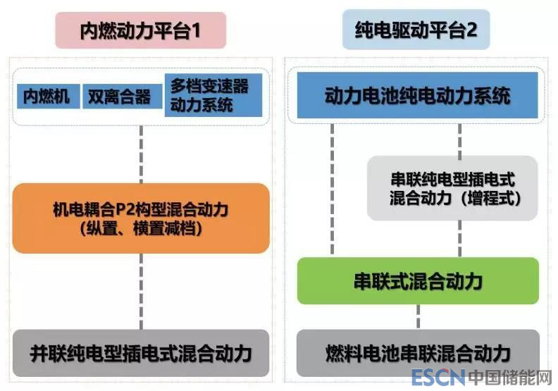混合動力發(fā)展需要解決的另一個重要問題是如何實現(xiàn)從純燃油動力到混合動力的平滑過渡和純電動動力與混合動力的無縫連接。因此,模塊化與平臺化發(fā)展將是主要技術路徑。基于原有的動力系統(tǒng)技術平臺,進行關鍵子系統(tǒng)模塊化組合與替換,向具有更好適應性和可行性的多種動力系統(tǒng)不斷進行技術推進與更迭將是主要的技術路徑。如圖4所示,基于傳統(tǒng)內燃動力平臺,可以發(fā)展模塊化并聯(lián)式混合動力系統(tǒng),并逐步演變?yōu)椴⒙?lián)純電型插電式混合動力系統(tǒng)。國內一些骨干企業(yè)正在實踐這一技術路線?;诩冸妱悠脚_,可通過添加傳統(tǒng)內燃機動力源形成串聯(lián)純電型插電式混合動力系統(tǒng),即增程式電動汽車(通常不是全性能型,而是城市型),進一步可向下兼容串聯(lián)式混合動力,進而再通過動力源的模塊化替換可以演變?yōu)槿剂想姵卮?lián)混合動力系統(tǒng)。以日產的技術發(fā)展路線為例,日產以其純電動汽車Leaf為平臺,增加發(fā)動機和發(fā)電機等模塊后,研發(fā)出串聯(lián)混合動力汽車NOTE e-POWER,進而以燃料電池系統(tǒng)進行動力源模塊化替換,演變?yōu)榇?lián)燃料電池混合動力汽車e-Bio Fuel Cell。