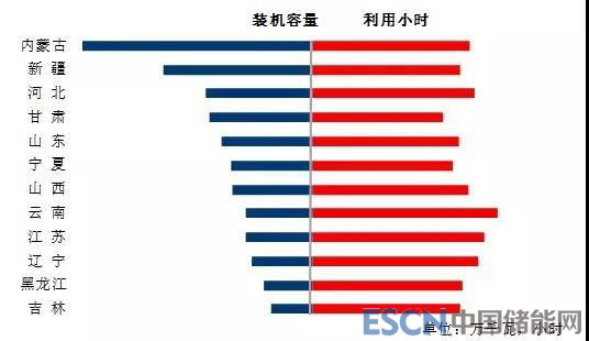 圖5 1-11月份風(fēng)電裝機(jī)較多省份風(fēng)電裝機(jī)容量和設(shè)備利用小時