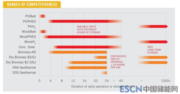 該報告證實(shí)了許多人可能認(rèn)為顯而易見的事實(shí):與太陽能發(fā)電或風(fēng)力發(fā)電相結(jié)合的電池儲能系統(tǒng)是短時間儲能框架(以及許多電網(wǎng)服務(wù))成本最低的選擇,而抽水蓄能電站是大約6-24小時儲能成本最低的選擇,可以與太陽能熱儲能技術(shù)進(jìn)行競爭。而對于長期儲能來說,采用氫氣儲能和生物質(zhì)儲能是成本最低的選擇。