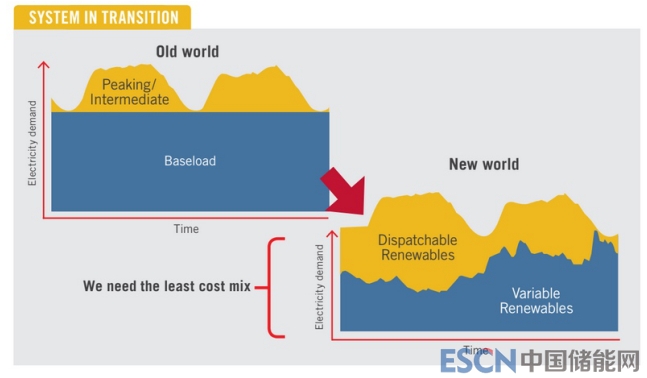 該報告明確指出,電網(wǎng)正在從“舊世界”向“可再生能源主導(dǎo)的世界”轉(zhuǎn)變,舊世界以煤炭發(fā)電為主,天然氣發(fā)電成本更高一些,而可再生能源發(fā)電以成本較高的儲能系統(tǒng)或可調(diào)度發(fā)電為主。這就是彭博新能源財經(jīng)公司創(chuàng)始人Michael Liebreich所描述的圍繞“基礎(chǔ)成本”可再生能源建立的系統(tǒng)。