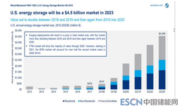 報告預(yù)測,美國儲能市場規(guī)模在2023年將達(dá)到45億美元,2018到2019年期間將成倍增長,2019到2020年也將再次翻倍增長。