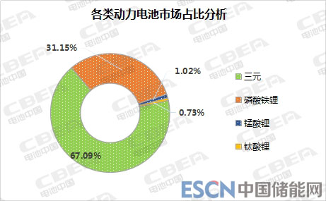 從不同動(dòng)力電池類型來看,5.93Gwh裝機(jī)總量中,三元?jiǎng)恿﹄姵匮b機(jī)量為3.98Gwh,占比67.09%;磷酸鐵鋰動(dòng)力電池裝機(jī)量為1.85Gwh,占比31.15%;錳酸鋰動(dòng)力電池裝機(jī)量為0.06Gwh,占比1.02%;鈦酸鋰動(dòng)力電池裝機(jī)量為0.04Gwh,占比0.73%。