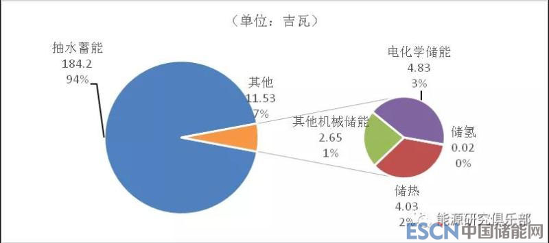來自美國能源部全球儲能數(shù)據(jù)庫(DOE Global Energy Storage Database)的數(shù)據(jù)顯示,截至今年6月底,全球累計(jì)運(yùn)行的儲能項(xiàng)目裝機(jī)規(guī)模195.74吉瓦(共1747個(gè)在運(yùn)項(xiàng)目)。其中,抽水蓄能184.20吉瓦(353個(gè)在運(yùn)項(xiàng)目);儲熱4.03吉瓦(225個(gè)在運(yùn)項(xiàng)目);其他機(jī)械儲能2.65吉瓦(78個(gè)在運(yùn)項(xiàng)目);電化學(xué)儲能4.83吉瓦(1077個(gè)在運(yùn)項(xiàng)目);儲氫0.02吉瓦(14個(gè)在運(yùn)項(xiàng)目),相應(yīng)類型規(guī)模占比如圖1所示。
