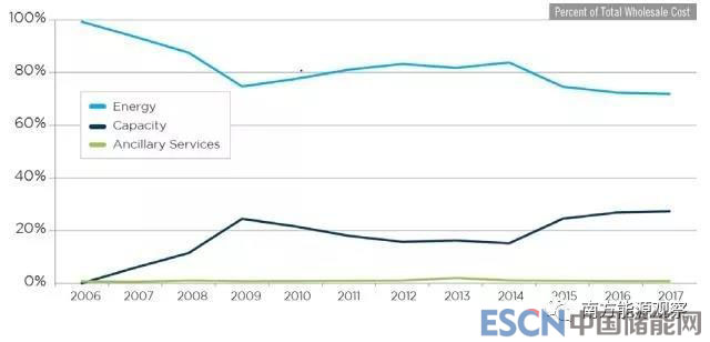 此外,從2006年到2017年間,PJM電力批發(fā)市場的成本結(jié)構(gòu)也發(fā)生了變化。從批發(fā)市場的角度看,發(fā)電廠能在能量市場、容量市場以及輔助服務(wù)市場中獲得利潤。圖一中藍(lán)色為能量市場占比,深藍(lán)色為容量市場占比。近年來,比例由以往的能量市場占絕對主導(dǎo)地位,變成了容量市場向上攀升。