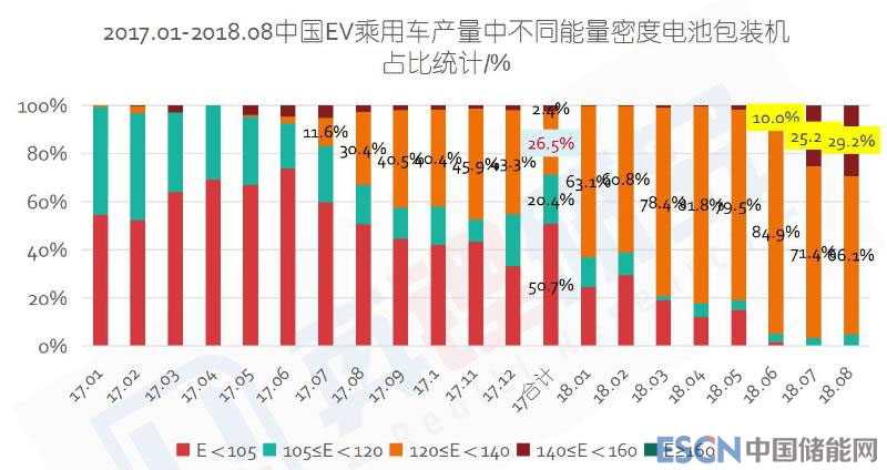 2017-2018.8 中國電動汽車乘用車產(chǎn)量中不同能量密度電池包的裝機(jī)占比 來源:真鋰研究