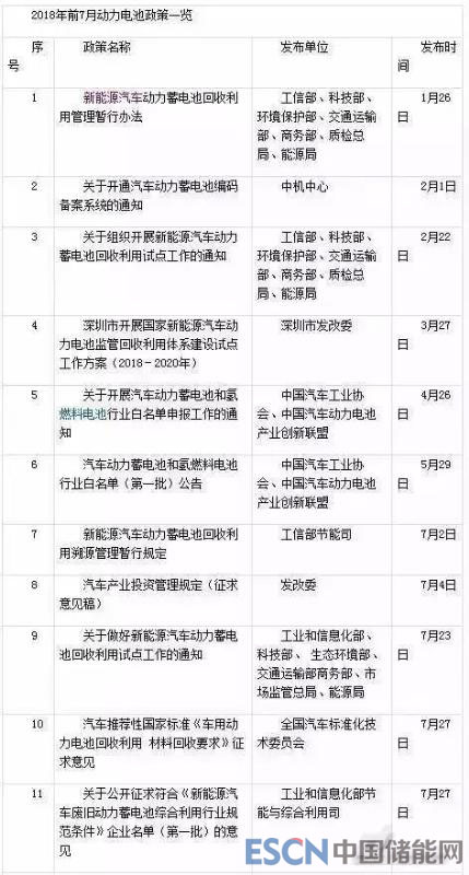 經(jīng)電動(dòng)汽車資源網(wǎng)統(tǒng)計(jì),2018年前7月,國(guó)家及地方共發(fā)布動(dòng)力電池方面的政策或標(biāo)準(zhǔn)10條,其中7條直接與動(dòng)力電池回收利用有關(guān),2條和動(dòng)力電池白名單有關(guān),1條和新建動(dòng)力電池企業(yè)投資項(xiàng)目有關(guān)。