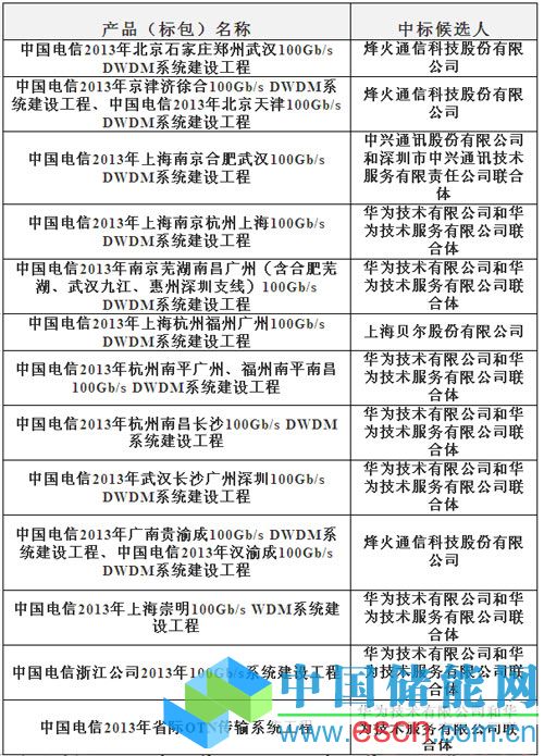 中國儲能網(wǎng)訊:中國電信2013年100G DWDM/OTN設(shè)備集中采購項目結(jié)果于今日出爐,從本次中標結(jié)果來看,獲得標包的四家設(shè)備商分別是華為技術(shù)有限公司和華為技術(shù)服務(wù)有限公司聯(lián)合體、中興通訊股份有限公司和深圳市中興通訊技術(shù)服務(wù)有限責任公司聯(lián)合體、烽火通信烽火通信科技股份有限公司、上海貝爾上海貝爾股份有限公司。其中華為獲得最多標包,這也表明華為在這一領(lǐng)域的優(yōu)勢和實力。華為憑借業(yè)界領(lǐng)先的100G技術(shù)和產(chǎn)品,在100G市場上贏得了主要份額。