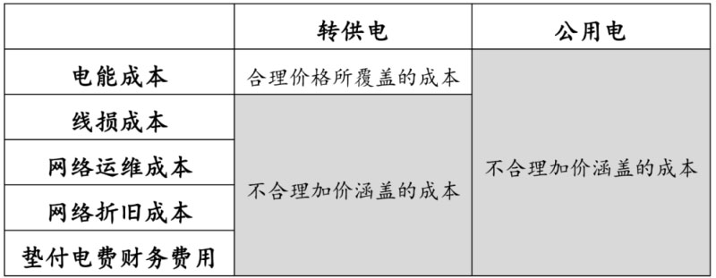 彌補轉供電成本和獲取超額利潤是轉供電主體違規(guī)加價的兩類主要動機。由于國家沒有嚴格管制,再加上轉供電主體大多沒有足夠的計量、測算能力,導致轉供電和公用電中的電能成本、線損成本、運維折舊和財務費用都被打包計入轉供電加價中,形成“成本黑箱”。轉供電主體此舉的首要目的是通過加價形式回收上述部分成本或全部成本。下表列式了打包計入轉供電加價的主要成本: