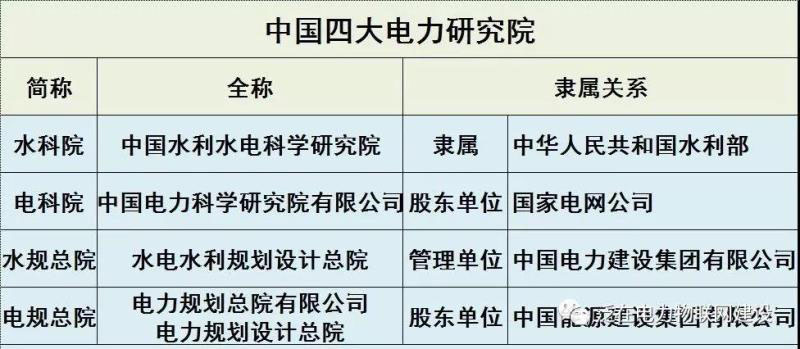 中國(guó)儲(chǔ)能網(wǎng)訊:在我國(guó)電力能源行業(yè),目前主要活躍著四大國(guó)字頭的電力研究院,分別是水科院、電科院、水規(guī)總院、電規(guī)總院,他們的全稱及隸屬關(guān)系見下表: