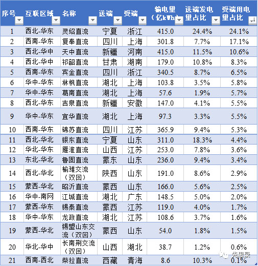 表2. 2019年主要跨區(qū)輸電工程按送端發(fā)電量占比排序