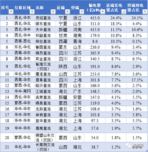 下表給出了主要跨區(qū)輸電工程按照送端發(fā)電量占比排序情況,其中,蒙西、蒙東地區(qū)按照各自營業(yè)區(qū)域統(tǒng)計;送端發(fā)電量占比沒有考慮送端省份線損。