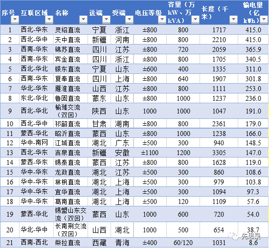 2019年,西北、西南和東北區(qū)域向華北、華東和華中負荷中心跨區(qū)輸電量分別達到2026、1062和541億千瓦時,相當于為負荷中心減排28947萬噸二氧化碳。其中,跨區(qū)輸電工程發(fā)揮了重要作用。下表給出了其中主要跨區(qū)輸電工程2019年的輸電情況。
