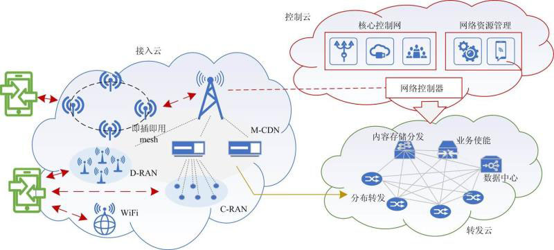 如圖4所示,5G網(wǎng)絡(luò)架構(gòu)可分為三個(gè)部分,分別為接入云、轉(zhuǎn)發(fā)云和控制云。接入云適應(yīng)各種無(wú)線(xiàn)鏈路接入,可實(shí)現(xiàn)高效的數(shù)據(jù)感知,網(wǎng)絡(luò)拓?fù)湄S富,有著集中式接入和分布式接入兩種接入架構(gòu)。轉(zhuǎn)發(fā)云在控制云的控制下,實(shí)現(xiàn)數(shù)據(jù)的低時(shí)延高效傳輸??刂圃瓶刂迫值男畔⒐芾聿⒈WC5G通信服務(wù)質(zhì)量,根據(jù)業(yè)務(wù)不同提供不同的差異化服務(wù),保證每個(gè)業(yè)務(wù)對(duì)象的需求。