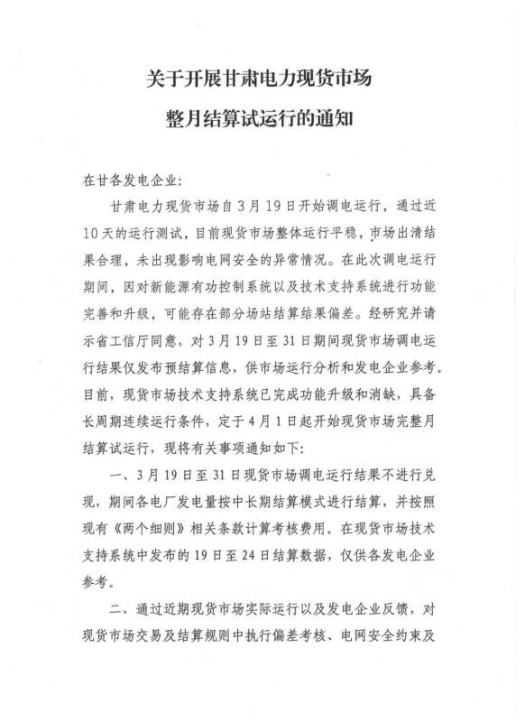 近日,甘肅電力調度中心發(fā)布《關于開展甘肅電力現貨市場整月結算試運行的通知》?!锻ㄖ诽岢?,目前現貨市場技術支持系統(tǒng)已完成功能升級和消缺,具備長周期連續(xù)運行條件,定于4月1日起開始現貨市場完整月結算試運行。