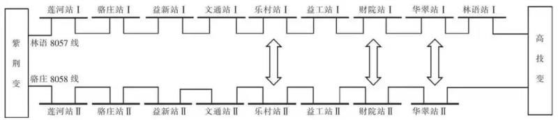 方案26 對應(yīng)的林語8057 線-駱莊8058 線的母線優(yōu)化與間隔優(yōu)化方案,需要調(diào)整的母線如圖7 所示,具體包括:林語8057 線的樂村站Ⅰ、財(cái)院站Ⅰ、華翠站Ⅰ換至駱莊8058 線;駱莊8058線的樂村站Ⅱ、財(cái)院站Ⅱ、華翠站Ⅱ改接至林語8057 線。需要調(diào)整的益新站間隔接線為:益新站Ⅰ的益南五分線換至益新站Ⅱ;益新站Ⅱ的益南三分線、益南六分線改接至益新站Ⅰ。