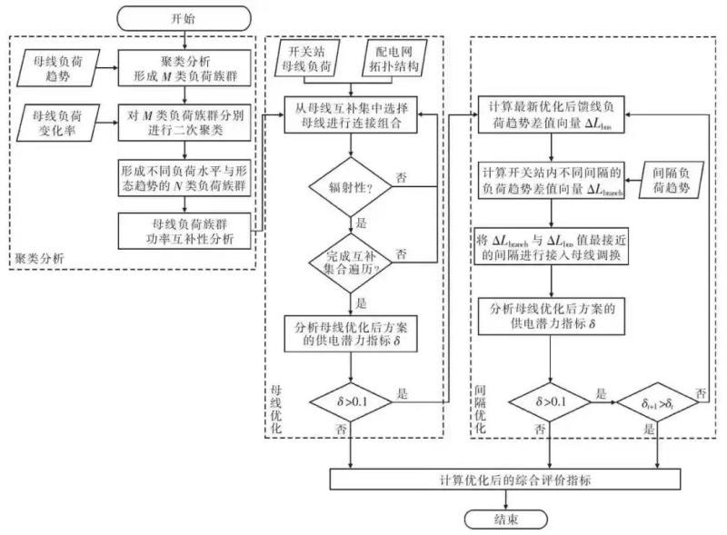 由于實(shí)際操作過程中,母線調(diào)整的實(shí)施工作量少于間隔調(diào)整的實(shí)施工作量,因此優(yōu)先對配網(wǎng)線路上的母線進(jìn)行優(yōu)化重組,若母線優(yōu)化后,線路仍具有較大的供電能力挖潛空間,則進(jìn)一步實(shí)施間隔優(yōu)化布點(diǎn),最終實(shí)現(xiàn)線路負(fù)荷降峰值、平波動(dòng)以及錯(cuò)峰互補(bǔ)的效果。