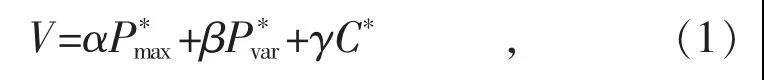 為綜合評(píng)判優(yōu)化方案的合理性,考慮優(yōu)化方案中線路負(fù)荷峰值、負(fù)荷均衡度以及優(yōu)化成本等因素,建立綜合評(píng)價(jià)指標(biāo)V: