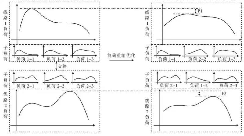 初始接線方式下,線路1 和線路2 的歷史日負(fù)荷曲線波動(dòng)均較大,峰谷值差異大,考慮到各子負(fù)荷所接入的用戶負(fù)荷類型存在差異,各子負(fù)荷的負(fù)荷峰值、用電高峰出現(xiàn)的時(shí)刻、負(fù)荷的波動(dòng)性均存在差異,如負(fù)荷1-2 與負(fù)荷2-2 的峰值時(shí)刻錯(cuò)開,且當(dāng)負(fù)荷1-2 處于峰值時(shí)段時(shí),負(fù)荷2-2 處于谷值時(shí)段。因此對線路1 和線路2 上的負(fù)荷進(jìn)行重組,將線路1 上的負(fù)荷1-2 與線路2上的負(fù)荷2-2 進(jìn)行互換,即重組優(yōu)化后的接線方式變?yōu)椋壕€路1 接入負(fù)荷1-1、負(fù)荷2-2、負(fù)荷1-3,線路2 接入負(fù)荷2-1、負(fù)荷1-2、負(fù)荷2-3。由圖1 可見,重組優(yōu)化后線路1 和線路2 上的負(fù)荷曲線波動(dòng)幅度變小,同時(shí)線路1 負(fù)荷峰值降低P1,線路2 負(fù)荷峰值降低P2,可接入更多的負(fù)荷,供電能力得到提升。