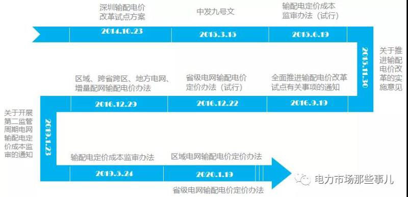 中發(fā)九號文發(fā)布之前,輸配電價(jià)改革試點(diǎn)工作已經(jīng)啟動(dòng),最早在深圳,下圖為輸配電價(jià)改革的時(shí)間點(diǎn):