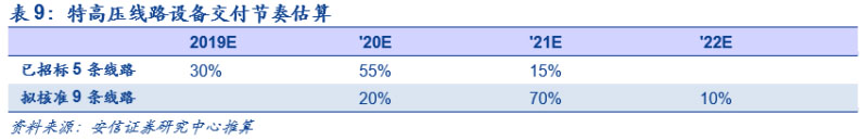 ■預(yù)計(jì)特高壓線路的建設(shè)交付主要集中在2020/21年。基于穩(wěn)增長(zhǎng)和清潔能源輸送的需要,短期內(nèi)集中上馬一批特高壓電網(wǎng)基建工程迫在眉睫。國(guó)家電網(wǎng)也明確加快推進(jìn)重點(diǎn)項(xiàng)目前期進(jìn)度,力爭(zhēng)盡早核準(zhǔn)開工,我們預(yù)計(jì)這14條線路中未核準(zhǔn)項(xiàng)目都有望在2020年內(nèi)核準(zhǔn)。從項(xiàng)目招標(biāo)時(shí)間節(jié)點(diǎn)及過往特高壓項(xiàng)目設(shè)備交付節(jié)奏來看,2020/21年是設(shè)備制造商交付大年,我們估算2019-2022年特高壓主設(shè)備的交付金額預(yù)計(jì)在87、228、283和34億元。