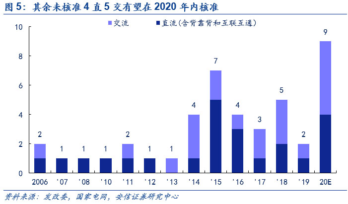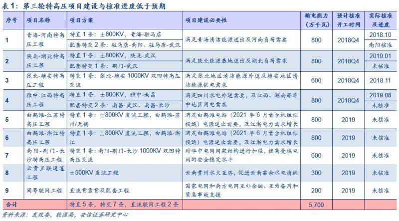 ■電網(wǎng)基建向來是穩(wěn)經(jīng)濟(jì)的壓艙石和助推器?!笆濉逼陂g,包括特高壓工程在內(nèi)的電網(wǎng)工程規(guī)劃總投資2.38萬億元,帶動(dòng)電源投資3萬億元,年均拉動(dòng)GDP增長(zhǎng)超過0.8Pct。過往特高壓項(xiàng)目出現(xiàn)三撥集中核準(zhǔn)與建設(shè)期,第一撥集中在2008/09年,4條特高壓線路啟動(dòng);第二撥是在2014/15年,能源局集中批復(fù)4交5直9條特高壓治霾輸電通道。2018年9月,面臨經(jīng)濟(jì)發(fā)展下行壓力和外部貿(mào)易環(huán)境惡化,能源局啟動(dòng)了第三輪特高壓項(xiàng)目,然而在后續(xù)的核準(zhǔn)推進(jìn)上均低于此前的時(shí)間安排。除青海-河南和張北-雄安1直1交按原計(jì)劃在2018Q4核準(zhǔn)外,目前仍有3直 5交線路未核準(zhǔn)。