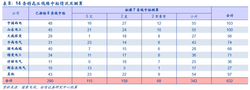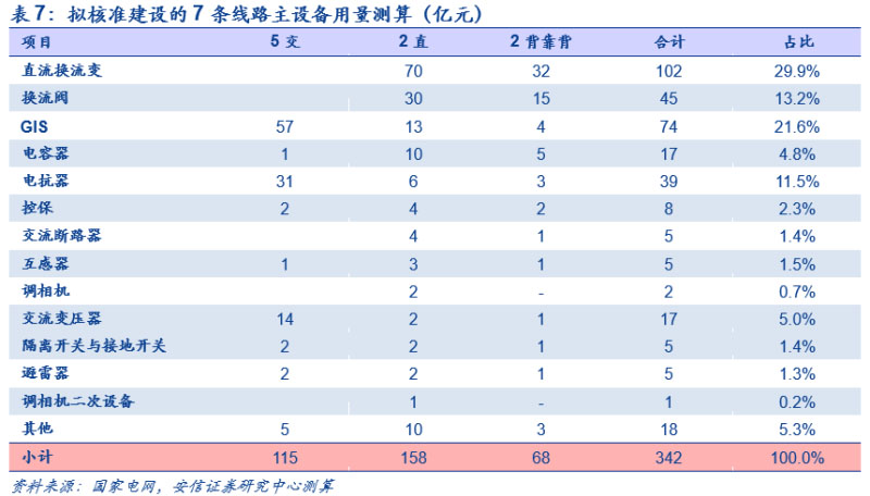 ■在建和即將啟動(dòng)的14條特高壓線路投資規(guī)模預(yù)計(jì)在2,000億。目前已經(jīng)有5條特高壓線路進(jìn)行了設(shè)備招標(biāo),站廳類設(shè)備預(yù)中標(biāo)金額290億元。參考已招標(biāo)設(shè)備用量及招標(biāo)價(jià)格,擬核準(zhǔn)建設(shè)的7條線路站廳類設(shè)備招標(biāo)金額測(cè)算在342億元。整體測(cè)算,14條線路的釋放的設(shè)備規(guī)模在632億元,如果只考慮變壓器、電抗器、GIS、換流閥、直流場(chǎng)開關(guān)設(shè)備等主設(shè)備,我們預(yù)計(jì)在500億元左右。