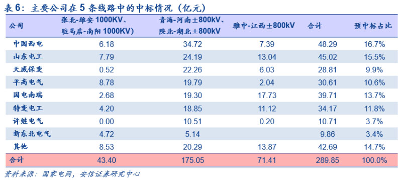 5條線路主設(shè)備招標(biāo)共計(jì)289.85億元,主要8家企業(yè)中標(biāo)占比85.3%。從招標(biāo)設(shè)備類型來看,主要為換流變、換流閥、GIS、交流變(含電抗器)、電容器等,占比分別為35.3%、15.6%、13.7%、10.1%和5.4%。從中標(biāo)企業(yè)來看,主要為中國(guó)西電、國(guó)電南瑞、山東電工、特變電工、平高電氣、保變電氣等企業(yè),中標(biāo)占比分別為16.7%、15.5%、13.7%、11.85%、10.6%和9.9%。