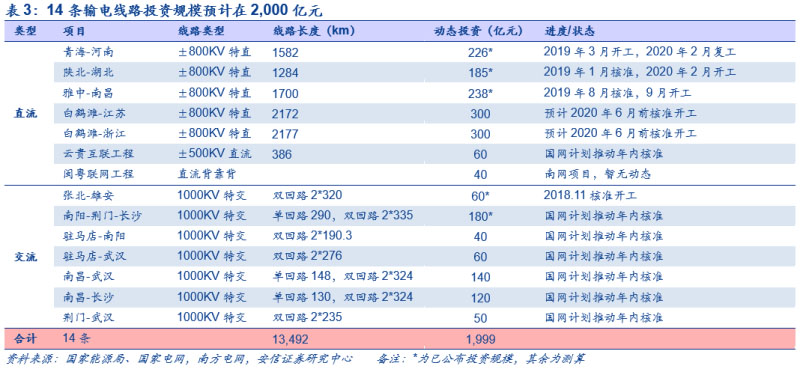 2.2. 在建和即將啟動(dòng)的14條特高壓線路投資規(guī)模預(yù)計(jì)在2000億