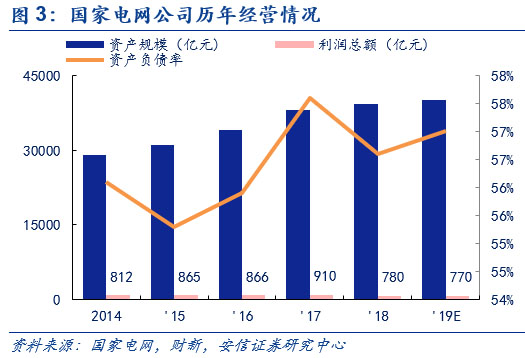 電網(wǎng)利潤(rùn)持續(xù)下滑,但仍能保持4,500億以上的投資能力。到2018年末,國(guó)家電網(wǎng)公司的資產(chǎn)規(guī)模約3.9萬億,資產(chǎn)負(fù)債率長(zhǎng)年保持在55%-57%之間。根據(jù)財(cái)新報(bào)導(dǎo),2019年國(guó)網(wǎng)利潤(rùn)總額持續(xù)下降,約為770億元。我們假設(shè)國(guó)網(wǎng)資產(chǎn)負(fù)債率保持在56%左右,以20年折舊+當(dāng)年的利潤(rùn)總額測(cè)算,國(guó)網(wǎng)公司投資能力仍能保持在4,500-4,900億之間。