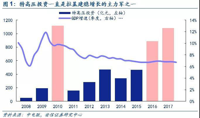 特高壓對(duì)拉動(dòng)經(jīng)濟(jì)發(fā)展的效應(yīng)顯著。過往特高壓項(xiàng)目出現(xiàn)三撥集中核準(zhǔn)與建設(shè)期,第一撥集中在2008/09年,4條特高壓線路啟動(dòng),2010年特高壓項(xiàng)目總投資規(guī)模達(dá)到了1,118億元;第二撥是在2014/15年,能源局集中批復(fù)4交5直9條特高壓治霾輸電通道,2016/17年特高壓投資規(guī)模則分別達(dá)到了886億元和1,080億元。