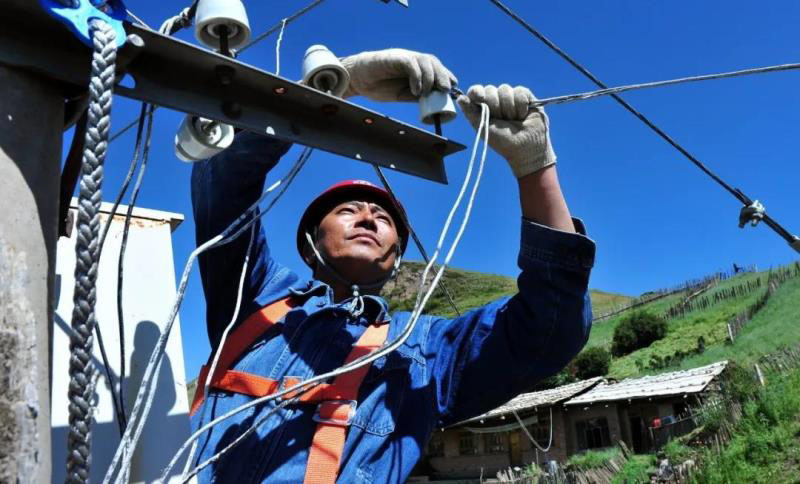 2015年8月,國網(wǎng)甘南供電公司無電區(qū)電網(wǎng)建設(shè)工作者為牧民檢修線路,點亮牧民生活。